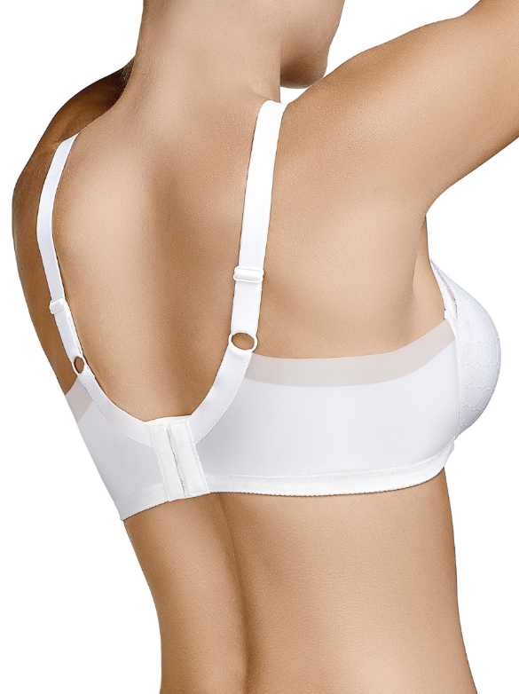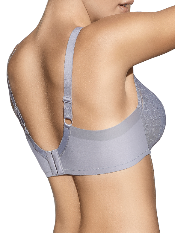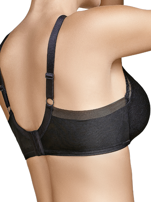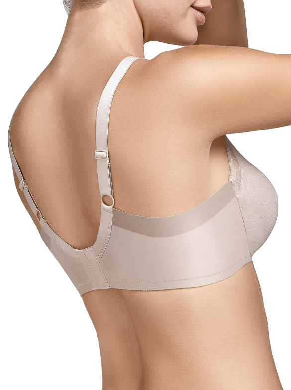 Novedoso y sofisticado sujetador con aros, sin relleno y elegante escote. Sus dos capas de tul superpuesto en la espalda proporcionan una adecuada sujeción al mismo tiempo que disimulan las irregularidades del costado.